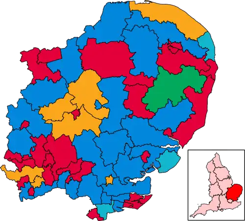 The East of England elected 61 MPs, three more than the 58 elected in 2019 general election.[9] The election was fought under the boundaries created by the 2023 Periodic Review of Westminster constituencies.[3] In the 2019 general election, the Conservatives won 52 seats in the region.[10] Labour won five and the Liberal Democrats won one (St Albans).[11]