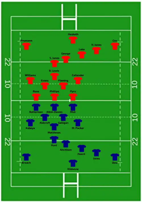 - Jasmine Joyce-Butchers, Kelsey Jones, and Nel Metcalfe were originally named in the respectively in the Welsh starting line-up on the wing, bench at hooker and bench on the wing, but withdrew before the match due to injuries. They were replaced by Lisa Neumann, Molly Reardon, and Courtney Keight respectively.[21][23]