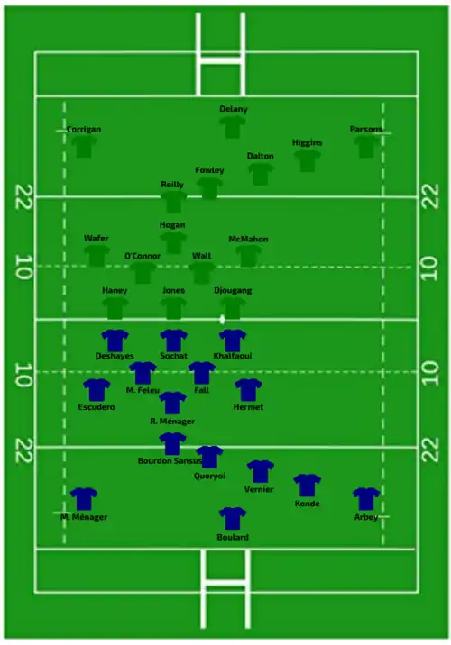 | Try: Sansus 3' c M. Ménager 32' c Fall Raclot 47' c Sochat 62' c Riffonneau 75' c Con: Queyroi (4/4) 4', 34', 49', 63' Bourgeois (1/1) 77' Pen: Queyroi (1/1) 38' | Report | Try: Wafer 71' c Dalton 78' c Con: O'Brien (2/2) 72', 77' Pen: Fowley (1/1) 14' |