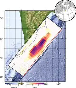 A finite fault model released by the USGS indicated slip on an approximately 600 km (370 mi) by 200 km (120 mi) section of the subduction zone and up to a depth of 75 km (47 mi). A majority of the rupture extended 500 km (310 mi) southwest along the subduction zone from the epicenter to the southern tip of Onekotan Island while some slip occurred 100 km (62 mi) northwest heading towards and under Cape Shipunskii. A 400 km (250 mi) by 150 km (93 mi) patch on the fault plane at 10–50 km (6.2–31.1 mi) depth to the southwest of the epicenter exhibited the highest slip. There, at 20–50 km (12–31 mi) depth, at least 5 m (16 ft) of displacement occurred and there were two elliptical areas within where slip exceeded 10 m (33 ft), peaking at 14.5423 m (47.711 ft). At shallower depth near the trench, the slip was limited to 2.5–3 m (8 ft 2 in – 9 ft 10 in).[3] The GEOSCOPE Observatory estimated that the earthquake ruptured the subduction zone for a duration of more than 180 seconds.[24] The USGS estimated the earthquake's duration to be about 240 seconds (four minutes).[3]