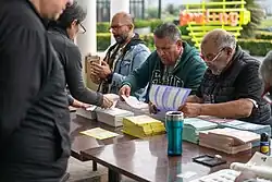 Poll workers distributing ballots to voters at a polling station