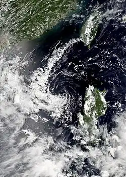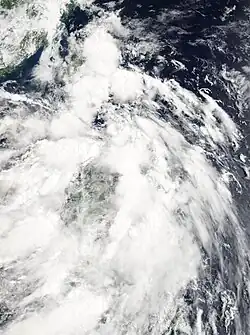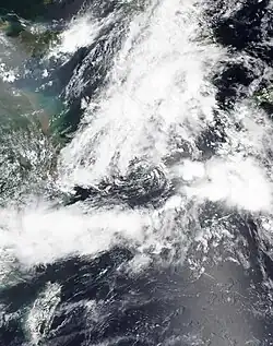 On June 11, the JMA announced that a tropical depression had developed east of the Philippines.[23] On the same day, PAGASA started monitoring the disturbance as a low-pressure area while it was still inside the Philippine Area of Responsibility (PAR).[24] By the following day, it had intensified into a tropical depression and was named Auring by the PAGASA.[25] The PAGASA reported that Auring made landfall in Taiwan and later weakened into a remnant low due to the frictional effects of its landfall.[26][27] The agency issued its final advisory when the system exited the PAR,[28] while the JMA continued to monitor it until it was last noted on June 13.[29] The system was not tracked by the JTWC.