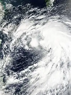 The following day, the depression intensified into a tropical storm and was named Wutip by the JMA.[14] At 18:00 UTC, the JMA further upgraded the system to a severe tropical storm.[15] As Wutip approached the subtropical ridge axis later on, it curved northeastward, briefly passed over the far western part of Hainan Island, and made its first landfall near Dongfang City at around 23:00 CST (15:00 UTC) on June 13,[16] before reemerging over the Gulf of Tonkin shortly after.[17] On June 14, the JTWC reported that Wutip had rapidly intensified into a minimal typhoon, although its deep convection had largely collapsed.[18] Later that day, Wutip made its second landfall near Leizhou City in Guangdong Province at around 12:30 CST (04:30 UTC).[19] After landfall, it weakened into a minimal tropical storm, as satellite imagery indicated that its eye had filled in.[20] The JMA downgraded Wutip to a tropical depression on the same day when it was inland, and continued tracking the system until it dissipated at 12:00 UTC on June 15.[21][22]