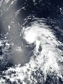 A tropical depression formed north of the Northern Mariana Islands on June 21.[34] As it continued to develop, the JTWC designated it 02W on the next day.[35] The system was situated in an area of low to moderate wind shear near the tropical upper-tropospheric trough, which limited outflow. Despite this, it still managed to intensify into a tropical storm on June 23, receiving the name Sepat from the JMA.[36] Steered northwest by a subtropical ridge located to its northeast, Sepat strengthened as its structure improved.[37] However, Sepat's convective activity decreased significantly on June 24, halting any intensification.[38] Later that day, the JTWC assessed that Sepat had weakened into a tropical depression as it slowed and entered a drier, more hostile environment.[39] A trough approaching from the west began to impart strong wind shear on the depression as it neared Japan and turned north-northeastward.[40][41] Further affected by colder sea surface temperatures, Sepat initiated its extratropical transition early on June 26, and as a result, the JTWC discontinued all advisories on Sepat.[42]
