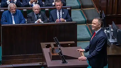 The President of Poland is elected for a five-year term using the two-round system; if no candidate receives a majority of the vote in the first round, a run-off is held between the top two candidates. Presidents serve a five-year term and can be re-elected once.[18] Presidential terms expire on 6 August 2025,[19] and the president-elect takes the oath of office on the same day before the National Assembly (a joint session of the Sejm and the Senate).[20]