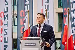 In the first round, Trzaskowski narrowly came first with 31.4% of the vote, while the right-wing candidates, Nawrocki, Sławomir Mentzen (Confederation) and Grzegorz Braun (KKP) overperformed polls, winning 29.5%, 14.8% and 6.3% respectively, coming in second, third and fourth.[4] Other candidates of the ruling coaliton underperformed and fell below expectations;[5] the centre-right candidate Szymon Hołownia (PL2050) received 4.99% of the vote while the left-wing candidates together secured 10.2%, with coalition candidate Magdalena Biejat (The Left) coming below opposition Adrian Zandberg (Razem).[8]