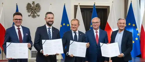 Leaders of coalition parties signing the coalition agreement, left to right: Szymon Hołownia (PL2050-TD), Władysław Kosiniak-Kamysz (PSL-TD), Donald Tusk (KO), Włodzimierz Czarzasty (NL) and Robert Biedroń (NL).
