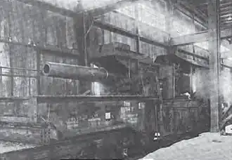 Ammunition was moved by means of an overhead rail from which a pair of shell tongs lifted up individual shells to be placed in the loading tray fixed to the breech. An extensible rail could be raised and braced in place to allow the tongs to reach shells placed on the ground or in an ammunition car behind the mount.[3] The gun had to be at zero elevation to load and thus it had to be re-aimed after every shot. The "Theodor Otto" fired several different shells with weights between 140 and 151 kilograms (309 and 333 lb). It used the German naval system of ammunition, where the base charge was held in a metallic cartridge case and supplemented by another charge in a silk bag which was rammed first.[4]