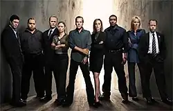 Season 5 main cast: (from left to right) Carlos Bernard, Louis Lombardi, James Morrison, Mary Lynn Rajskub, Kiefer Sutherland, Kim Raver, Roger Cross, Jean Smart, and Gregory Itzin