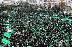 The 25th anniversary of the founding of Hamas took place on 8 December 2012. A rally involving hundreds of thousands of Palestinians was held in the Gaza Strip and various celebrations were conducted all over the Palestinian Authority.[1] Thousands of jubilant Hamas supporters openly raised green flags in the West Bank, to celebrate the Islamic organization's 25th anniversary.[2]