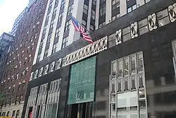 The northern elevation on 40th Street contains eight bays; the main entrance is recessed in the fifth bay from the west.[35] The main entrance has revolving and swinging metal doors, above which is a black metal transom bar with the words "275 Madison Avenue". Atop this bar is a transom window split into four rows of five panes.[35] The panes are separated by vertical mullions, which are flared at the bottom and contain seashell-shaped lighting sconces between them.[26][35] From top to bottom, the rows of openings contain plain windows, sash windows, rectangular metal spandrels, and plain windows.[35] The metal spandrels contain a black representation of a skyscraper with part of a silver "starburst" motif at the top.[26][35] The starburst motifs may represent the Lone Star State, the state nickname of Texas, where Houston Properties was based.[36] To the left and right of the main entrance are metal grilles with full starburst motifs.[26] On the left wall of the entryway is a metal door. Above the entryway and slightly in front of the building's outer wall, there is a translucent glass panel with the metal characters "275".[37]
