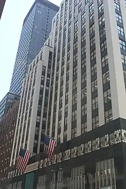 In early 1931, New York Trust temporarily moved out of its existing offices to allow the completion of the skyscraper.[41][42] The New York Trust bank branch at 22 East 40th Street opened in July 1931.[42][67] The renting agents, Cross & Brown, ran advertisements proclaiming that the building was being developed in "Uptown Wall Street" and promising "superior floor arrangements".[11] Among the earliest office tenants were the Aeronautical Chamber of Commerce,[68] the American Bankers Association,[69] the American Safety Razor Company,[70] the Radio Manufacturers Association,[71] accounting firm Haskins & Sells,[72] paper distributor Gottesman & Co.,[73] and Swedish royal family relative Folke Bernadotte.[74] Franzheim's office and engineering companies Fish & Loenenger and Krey & Hunt took the top three floors.[23][24] The early tenants also included law firms, a publicist, a real estate broker, and publishers,[4] as well as attorneys[75][76] and a firm of sales management engineers.[77]