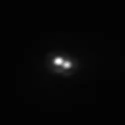 2MASS J0920+3517 was first discovered in 2000 by J. Davy Kirkpatrick et al., using 2MASS photometry and Keck spectroscopy. The optical spectral type was measured to be L6.5 and the distance was estimated to be 21 parsec.[5] Shortly after the discovery, a paper by Ian Neill Reid et al. used Hubble WFPC2 to search binary L dwarfs and found that 2MASS J0902+3517 is extended in the F814W image, but not in the F606W image, showing that it has a red companion. The pair is separated by 70 milliarcseconds. Using the available distance at the time, this translated to a separation of 1.6 astronomical units.[6] In 2017 the dynamical mass was measured by Trent J. Dupuy and Michael C. Liu and showed that the binary is overly massive with 187±11 MJ and with the B component being more massive. This showed that the B component is in fact two brown dwarfs of equal masses. The A component could be either a low-mass star or a high-mass brown dwarf.[3]