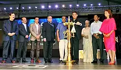 The Minister of State (Independent Charge) for Information & Broadcasting, Shri Manish Tewari lighting the lamp to inaugurate the 44th International Film Festival of India (IFFI-2013), in Panaji, Goa on November 20, 2013. The Chief Minister of Goa, Shri Manohar Parrikar, the Secretary, Ministry of Information and Broadcasting, Shri Bimal Julka, Actor Kamal Haasan, Actress Waheeda Rehman and American actress Mrs. Susan Sarandon are also seen.