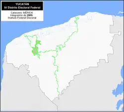 Between 1996 and 2022, Yucatán had five federal electoral districts. Under the 2017 scheme, the 4th district's head town was at Mérida and it covered 230 precincts in the north of the municipality.[12][11]
