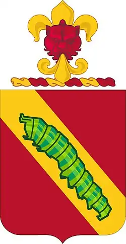 A Gold color metal and enamel device 1+1⁄4 inches (3.2 cm) in height overall consisting of a shield blazoned: Gules on a bend Or a caterpillar passant Vert.