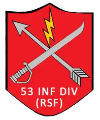 The 53 Division is an elite combined infantry division of the Sri Lanka Army. Trained and formed in 1996 under the leadership of US military officers, the unit was used as a principal offensive division during the War, having been deployed for combat operations in the Jaffna Peninsula, and was under the command of Security Forces Headquarters - Jaffna. The brigades of the 53 Division are also trained by the US Special Forces, which have been closely involved with its development and training since 1997. The 53 division consists of the Airmobile Brigade, a Mechanised Infantry Brigade and a Special Forces Brigade. At present, it is headquartered at Inamaluwa, Dambulla and serves as one of two infantry divisions in the Reserve Strike Force (RSF) under the direct command of the I Corps capable of acting as a rapid reaction force (RRF).[1]