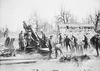 The ASC company was absorbed into the brigade's ammunition column on 25 April.[9] The battery was reassigned to VII Corps Heavy Artillery on 11 May.[10] When 96th Siege Bty arrived from the UK it took over 62nd Siege Bty's 9.2-inch howitzers in their emplacements on 25 May.[10][13] The battery's personnel then joined X Corps with Fourth Army on 8 June[10]