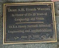 On June 29, 2001, Wazzan was honored with a tree dedication and plaque permanently mounted outside Boelter Hall, UCLA inscribed "Dean A. R. Frank Wazzan - In Honor of his 15 Years of Leadership and Vision."[21]