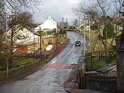 Within central Bellshill, there is a dual designation due to the partial one-way system in force: southbound traffic continues straight on Hamilton Road then turns southeast on Crossgates (the B7070 heads southwest to Orbiston) until meeting an elongated roundabout, while northbound traffic from this roundabout can either take the same route or use the one-way Motherwell Road and Main Street to re-join North Road at the partially-pedestrianised Bellshill Cross, where there has been a statue of local footballer Billy McNeill since 2022.[4] Both routes cross under bridges carrying the Shotts Line either side of Bellshill railway station, both with fairly low 4.3 metres (14 ft) clearances. After the two roads meet at the roundabout, a dual carriageway leads traffic out of Bellshill and over the valley of the South Calder Water on the Holm Forge Bridge, a 1930s replacement for the older crossing of the same name which still exists as a footbridge downstream and is part of the local Greenlink Cycle Path network.[5]