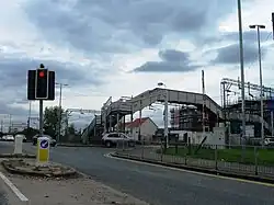 The A721 meets the West Coast Main Line at North Motherwell, with a level crossing and pedestrian footbridge required for connection to the neighbourhood on the other side of the tracks