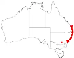 Acacia baueri occurs from Fraser Island in Queensland and south to Sydney in New South Wales.[2] Subspecies aspera is restricted to the Blue Mountains, Royal National Park and Wilton in New South Wales, where it grows in exposed, rocky places in low heath.[5][11] Subspecies baueri grows in coastal heath in often waterlogged soil from Fraser Island to Botany Bay in New South Wales.[5][12]