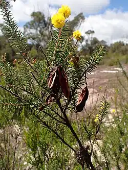 • Acacia brunioides subsp. granitica Pedley has phyllodes 5–12 mm (0.20–0.47 in) long and bright yellow flowers, and pods 9–15 mm (0.35–0.59 in) wide.[4][9][10]