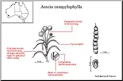 2. ^ a b Cowan, Richard S.; Maslin, Bruce R. Kodela, Phillip G. (ed.). "Acacia campylophylla". Flora of Australia. Australian Biological Resources Study, Department of Climate Change, Energy, the Environment and Water: Canberra. Retrieved 8 June 2025.