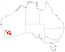 This species of wattle is native to a small area between the Chiddarcooping Nature Reserve north east of Merredin and from Gibb Rock to Hyden and Lake Hurlstone in the Avon Wheatbelt, Geraldton Sandplains and Mallee bioregions of south-western Western Australia.[7] It grows near granite outcrops or along watercourses in gravelly loam soils in Melaleuca scrub or low heath and in Eucalyptus stowardii and Allocasuarina campestris shrubland.[2]