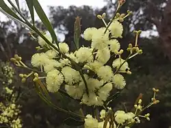 The erect or sprawling shrub typically grows to a height of 0.2 to 0.5 metres (0.7 to 1.6 ft). It blooms from June to October and produces yellow flowers.[1] The shrub can be either single or multi-stemmed, sprouting from a woody root-stock. The branchlets are pruinose and prominently ribbed. The pungent, greyish green phyllodes are slightly inequilateral with a narrowly elliptic to straight or shallowly incurved shape. Phyllodes are 1 to 5 centimetres (0.4 to 2.0 in) in length with a width of 4 to 12 millimetres (0.157 to 0.472 in) long. The inflorescences are two to four headed. The prolific, showy, globular heads contain 7 to 12 loosely grouped bright golden flowers. The woody dark brown seed pods that follow have a twisted narrowly oblong shape. The pods are up to 5 cm (2.0 in) long and 8 to 9 mm (0.315 to 0.354 in) wide with thick margins. The oblong to circular seeds found in the pod are shiny, greyish brown and 3 to 4 mm (0.118 to 0.157 in) long.[4]