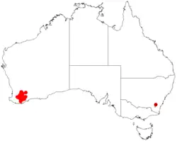 It is native to an area in the Wheatbelt and Great Southern regions of Western Australia from around Corrigin in the north to Mount Barker in the south and is found in damp low-lying areas growing in sandy, clay or loamy soils often with lateritic gravel[1] and is usually a part of open Eucalyptus wandoo woodland communities or in disturbed areas.[2]