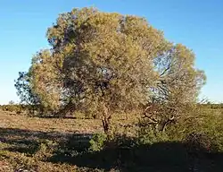 The dense rounded shrub or tree typically grows to a height of 0.8 to 3 metres (3 to 10 ft).[1] The slightly angular and glabrous branchlets are sometimes resinous. The pungent green phyllodes are ascending to erect and slightly incurved. The phyllodes have a length of 5 to 11.5 cm (2.0 to 4.5 in) and a diameter of 1 to 1.3 mm (0.039 to 0.051 in) and have eight closely parallel nerves separated by deep furrows.[2] It blooms from August to September producing yellow flowers.[1] The simple inflorescences are sessile spikes usually tapering towards the apex when budding. The inflorescences have a length of 10 to 28 mm (0.39 to 1.10 in) with a 3 to 5 mm (0.12 to 0.20 in) densely covered in pale golden to dark golden flowers. The linear seed pods that form later are deflexed and raised over but not often constricted between seeds. Each pod is to around 7 cm (2.8 in) in length and a width of 3 to 4.5 mm (0.12 to 0.18 in). The glossy black seeds within the pods are longitudinal with a broadly elliptic to oblong-elliptic shape and have a length of 3 to 4 mm (0.12 to 0.16 in).[2]
