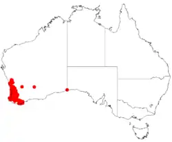 It has a scattered distribution from the Mid West, Wheatbelt, Peel and Great Southern regions. It is found as far north as Three Springs, south as Albany and east as Mukinbudin. The plant is able to grow in loam, sandy or lateritic soils and is often found in winter wet depressions[3] and is a part of the understorey in woodland or open woodland communities.[4]