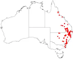 It is found in eucalypt woodlands and shrubby heaths in both Queensland and New South Wales.[3]