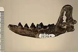 The holotype consisted of portions of a snout containing the palate with some teeth. Stock noted overall similarities to their contemporary genus Alopecocyon of Europe, though he tentatively classified Actiocyon as a procyonid due to the structure of fourth premolar and first molar.[1] Some later authors have suggested Actiocyon to be a junior synonym of Alopecocyon,[2][3] though others have maintained the two as separated but related genera due to difference in dental and jaw morphology.[4] A second and earlier species, A. parverratis, was described by Smith et al. (2016) and was the earliest known simocyonine from North America.[4]