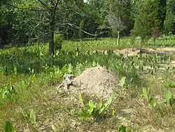 The Adams Lake prairie is a dry, sparsely vegetated area. The only trees in the prairie opening are sporadically occurring red cedar, post oak, and others which can survive the extreme soil conditions. Rare plants in the prairie include cylindrical blazing star, scaly blazing star, rattlesnake-master and blackjack oak.[4]