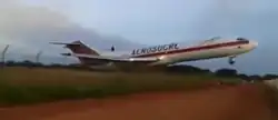 The 727 used all of the 1,800-metre (5,900 ft) runway, but was still not airborne. It traveled another 95 m (310 ft) over grass and struck a perimeter fence. It then crossed a road on the airport's perimeter, where numerous motorcyclists and pedestrians narrowly avoided being hit by the aircraft. After crossing the road, the 727 then collided with a shed, then a tree, before finally becoming airborne. The impact detached the right main landing gear from the aircraft, damaged the inboard right flap, caused engine 3 to lose power, and damaged one hydraulic system, causing it to leak. The aircraft achieved an altitude of 790 ft (240 m), entered a slight right-hand descending turn, which completed a near 270° arc, and then impacted flat terrain, bursting into flames.[1] The accident was captured on video by some of the motorcyclists on the perimeter road the aircraft crossed.[4]