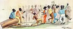 Slaves had a high demand in wartime;[1] during the Ragamuffin War (1835-1845), when they made up more than a third of the rebellious forces, together with mestizos, Indians, and runaway slaves from Uruguay, they played a relevant role, especially the black lancers ("lanceiros negros"), battalions made up of freed slaves who were decimated in the Porongos Massacre, an episode that has become emblematic and has fueled an extensive debate.[6][7] A considerable mestizo population also began to form. The black and mixed-race contingent formed in the state was large: In the 1814 census, there were more non-whites than whites; at the abolition of slavery in 1888, the state was the sixth in the country in number of slaves.[8] In Pelotas, for example, black and mixed-race people made up 30.7% of the population, and in Rio Grande, 27.4%.[9] This labor force was responsible for much of the state's economic emancipation process, mainly due to its massive presence in the charqueadas, which until the late 19th century were the largest source of foreign exchange.[4][3][10] Currently, African descendants make up about 20% of the Gaúcho population,[11] and have contributed significantly to multiple areas of culture and society.[12]