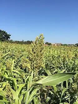 The main crops in this area are millet, sorghum and cowpea (see Figures 4 to 6), while groundnut and sesame are considered minor crops.[10] Guna (cow) melon (Citrullus lanatus) has been recently added to crop production for the market. It requires only one fall of rain, is planted late in the season, and grows on moisture that is left in the soil until it is harvested during the months preceding the next year's rains. This crop is a significant supplier of edible oil.[1] Plants grown as field boundaries include the henna bush (Lawsonia inermis) as well as various grasses. Intercrop spreads are also planted among the grains; they often consist of cowpeas or groundnuts, which are nitrogen-fixing plants. A density of mature trees is also maintained.[3]