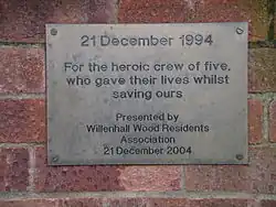 A brass plaque remembering the event is now located in Middle Ride, close to the crash scene, which was erected on the 10th anniversary of the accident by the Willenhall Wood Residents Association.[5]