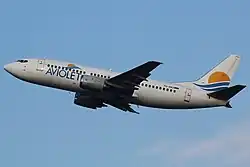In May 2014, Air Serbia launched their now-defunct[42] charter brand, Aviolet (Serbian Cyrillic: Авиолет),[43] using a fleet of three Boeing 737-300s[44] under Air Serbia's IATA airline code (JU).[42] The majority of Aviolet charter flights were operated during the peak holiday season, which runs from June to September. The first Aviolet-branded flight took off from Belgrade on 4 May 2014, flying to Antalya.[45] As of 2021, Aviolet is defunct as the charter operations were taken over by Air Serbia itself.[42]
