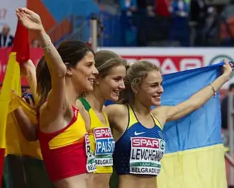 2017 European Indoor Championships podium (R.Beitia, A.Palšytė, Y. Levchenko)