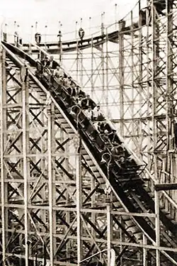 Originally planned to be named "The Bobs" (like many of Church's other coasters), the coaster was first named "Aeroplane Dips" in honor of Charles Lindbergh's noted flight from New York to Paris.[2] Over the next few years, the name was changed to "Aero-Coaster" and finally "Airplane Coaster" (although Aero-Coaster persisted among many as a nickname).[2] The coaster was the largest built at Playland. It had multiple levels with many spirals, as well as steep drops and curves. Most commented on were the bottleneck curves where multiple tracks seemed to converge.[2] It had many similarities in design elements to The Bobs at Riverview Park in Chicago, Illinois.[4]