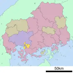 Aki (安芸郡, Aki-gun) is a district, and is within the Minami-ku, Hiroshima ward, Ward (electoral subdivision), one of the eight wards that comprise the Hiroshima Prefecture, in Japan. 'Minami', is Japanese for 'South'. 'Ku', is loosely suggestive of a division, such as 'compartment', 'boundary', etc..