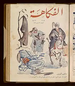 The Arabic-language satirical weekly al-Fukaha (Arabic: الفكاهة; DMG: al-Fukāha; English: "Humour" or "Joke") was published in Cairo between 1926 and 1933.[1] The famous publishing house Dar al-Hilal edited seven volumes with a total of 369 issues.[2][3] The 48-page periodical largely started with a caricatural cover picture.[4][5] A large range of caricatures, comics and illustrations supplemented the satirical texts whereby the style was reminiscent of the New Yorker art and Pin-Up-Art of that time.[6] On the one hand the journals satire targeted the Cairo daily life, on the other hand the international social scene.[7] In 1933 Dar al-Hilal combined both journals al-Fukaha and al-Kawakib to the satire magazine Al-Ithnayn (meaning "The Two" in English).[8]