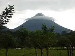 A seminal event in Alajuela's history was the 1968 eruption of Volcán Arenal.[13] Residents previously referred to it as Mount Arenal. In the years before the eruption, residents reported rises in groundwater temperature and slight tremors. Beginning on 28 July 1969, residents of surrounding towns reported constant tremors.[14] The eruptions began on 29 July, spewing ash into the neighboring provinces and launching boulders into the sky.[13] The initial explosions were so strong that three craters were instantaneously created.[14] The cities of Tabacón, Pueblo Nuevo, and San Luís were buried, killing 87 people.[13] Crops were destroyed, and livestock killed.[13]