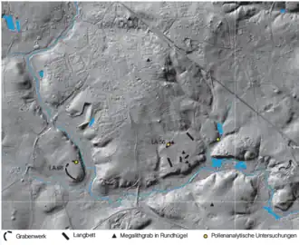 The Albersdorf region is part of the old moraine landscape of Dithmarschen, which is shaped by smooth hills. The region is characterised by numerous Neolithic monuments. The Archaeological-Ecological Centre Albersdorf[6] is also located here, where several reconstructed megalithic graves can be seen. Within the municipal boundary of Albersdorf, 15 monumental burial mounds of the Funnel Beaker Culture are attested, eleven of which are still visible today.[5][7] In addition, numerous Late Neolithic burial mounds as well as Bronze Age burial mounds are documented.[7][8]