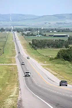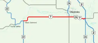 Highway 7 begins in the Town of Diamond Valley, which was created on January 1, 2023 with the merger of the towns of Black Diamond and Turner Valley.[3] The highway continues east, passing along the southern boundary of the Town of Okotoks. East of Okotoks, the highway ends at Highway 2 north of the Hamlet of Aldersyde, and is succeeded by Highway 547.[1][2][4]