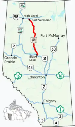 Highway 88 begins at its intersection with Highway 2 at the Town of Slave Lake, passing through Red Earth Creek and Fort Vermilion and ending at Highway 58 approximately 57 km (35 mi) east of the Town of High Level. It crosses the Peace River approximately 13 km (8.1 mi) south of Highway 58. The total length of the highway is 428 km (266 mi).[1][3]