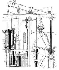 The building was designed by the architect Samuel Wyatt.[2] The engines were supplied with water taken directly from the River Thames.[3] At the time, they were "the most complete and powerful which had been produced by the Soho Manufactory". The mill's wheels and shafts were made of iron. An exception to this were some of the cogs, which were of hard wood, though others were of cast iron, as were the pinions. The teeth, some of wood and others of iron, were manufactured by chipping and filing into epicycloidal shapes. The shafts and axles were made of iron and the bearings of brass.[4] The mill's double engine, producing 50 horsepower (37 kW), drove 20 pairs of millstones, each grinding some nine bushels of corn an hour.[5] It also provided power for raising corn, fanning it to free it of impurities, sifting it, dressing the meal and lowering it into the barges, which made the process more efficient.[4]